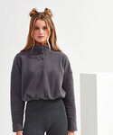 Cropped pull-over fleece with high neck. 1/4 neck popper fastenings to front. Elasticated waistband. . BSCI certified. Oeko-Tex certified. REACH certified. WRAP certified. We recommend using block out vinyl and inks.Product contains no branded neck or waist label.* Removable Kimble or looped garment tags. Inner seam label holds important product information on one label with a second label containing brand information which can be cut-away.